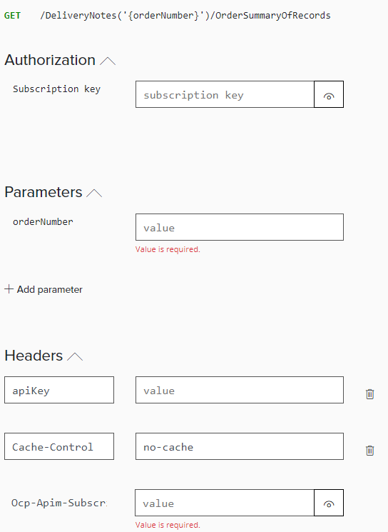 In addition to adding your subscription key in the request header, you will also need to provide a clinic’s API key. This will grant you access to delivery notes regarding a specific clinic. Both API keys are described in more detail in the following table.