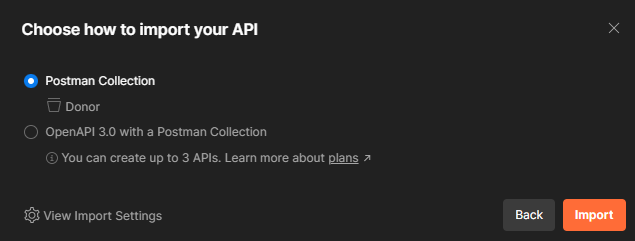 After you have imported the collection file you should see the name of the API, and its operations like for this example of the Donor API.