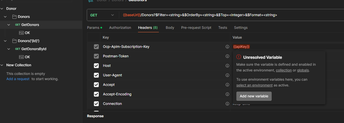 Once that has been copied - go to postman and add the values to the header parameter in the top like shown below - click the operation, find the headers under headers tab and select the {{apiKey}} value and add new variable which is the key. You will be asked to choose the scope level - please select the collection as the scope